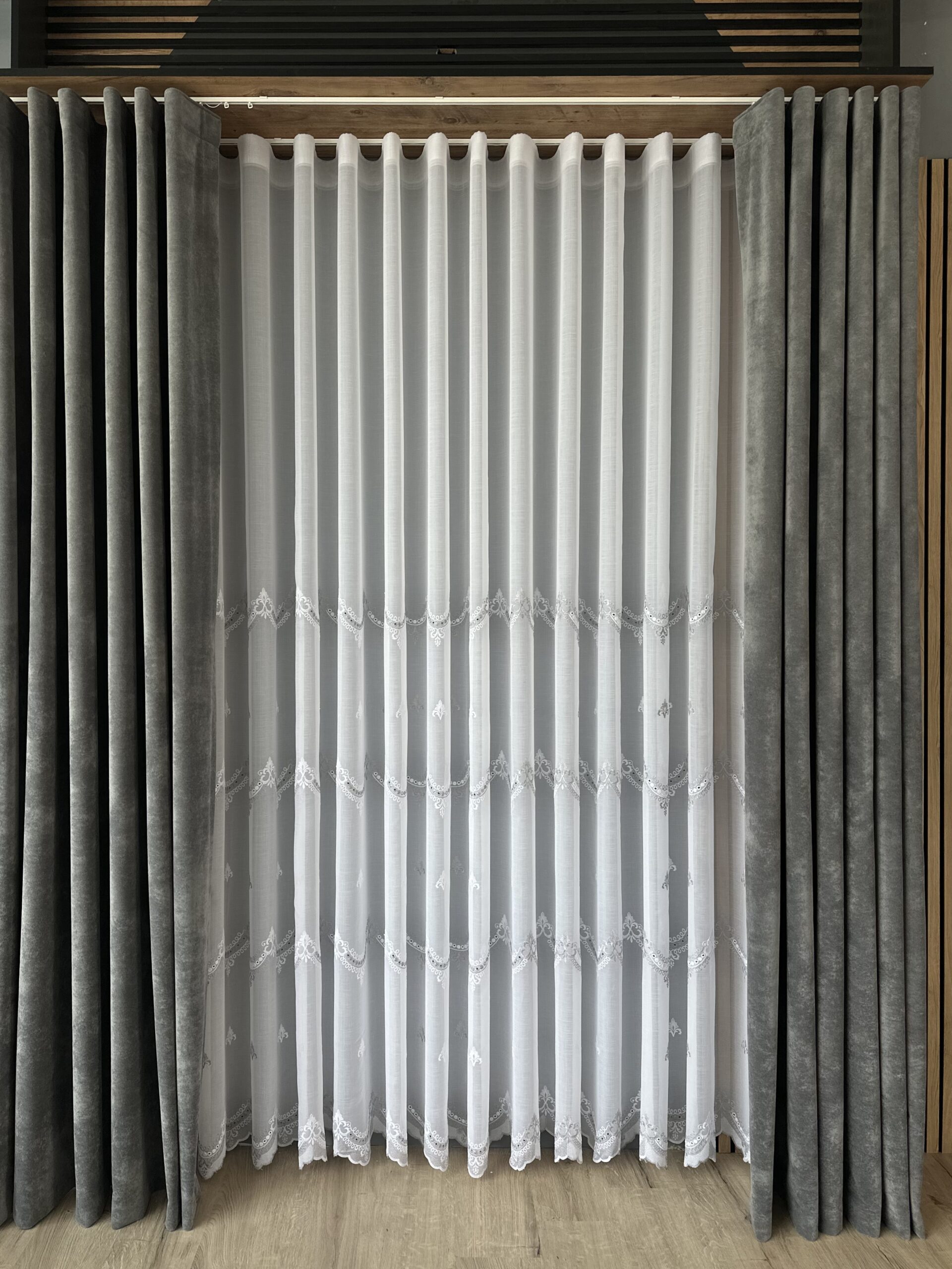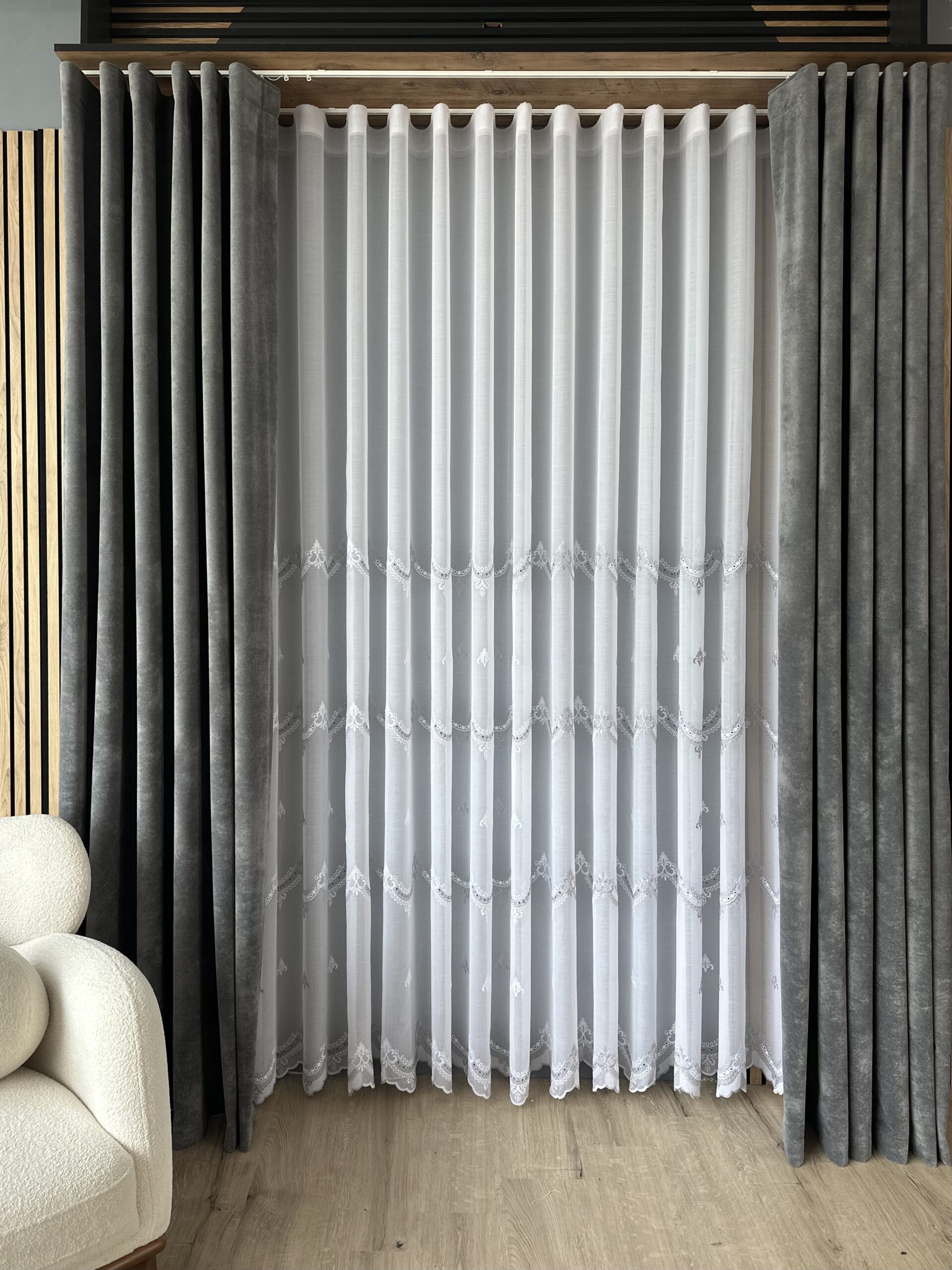 Perdea din In cu Broderie Eleganta Maria Alba /Gri 25pr139