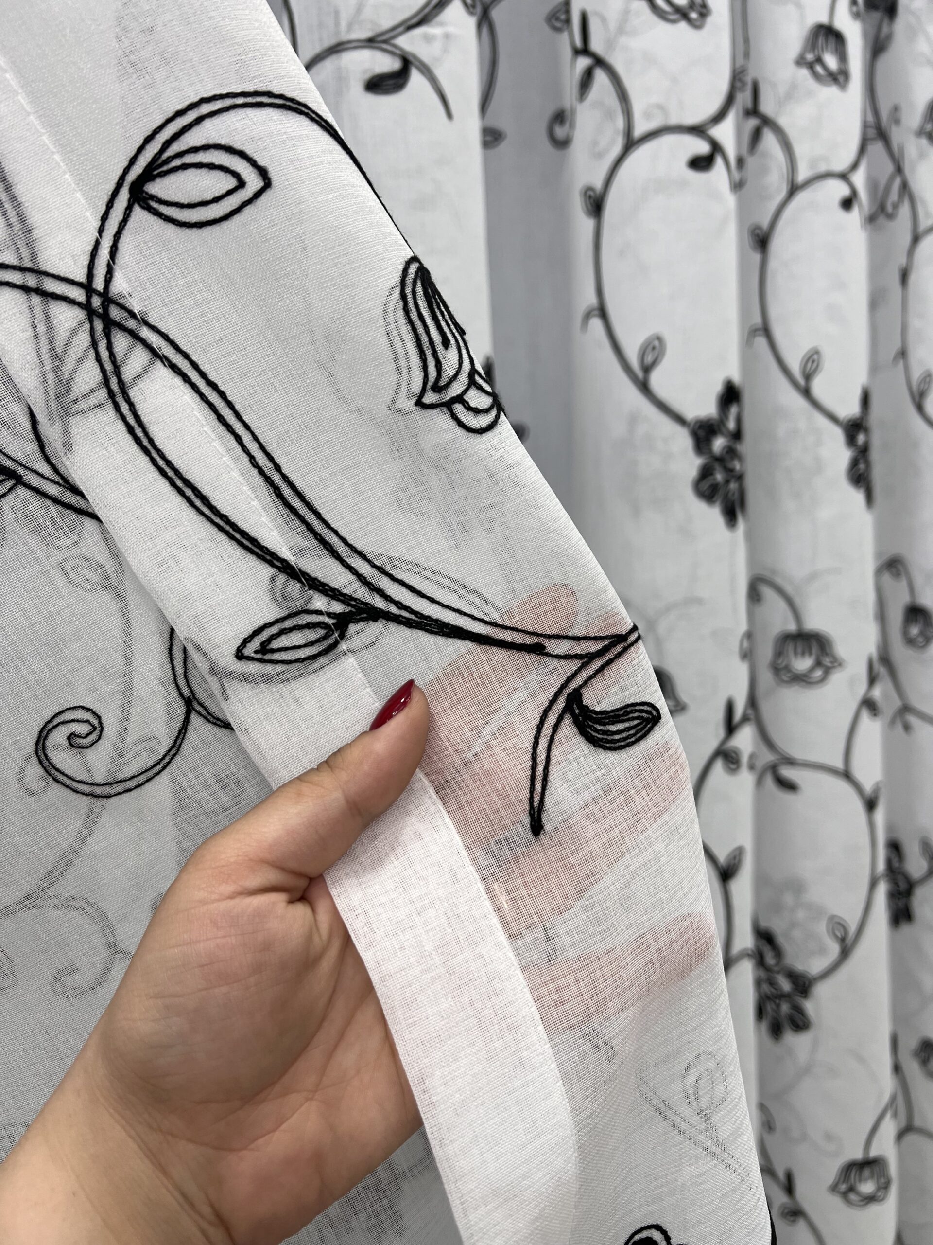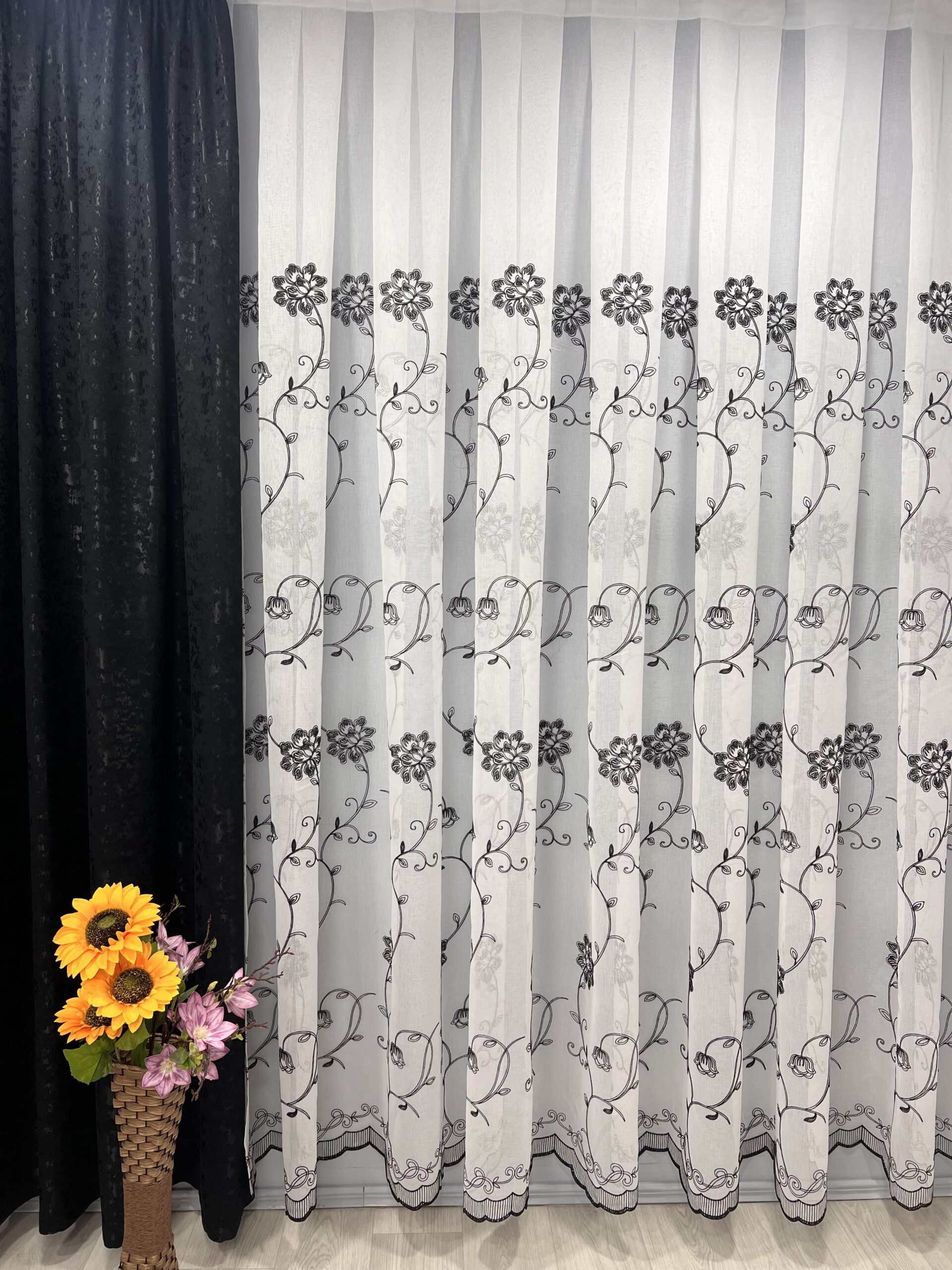 Perdea In cu Brodat Flori Negru cu L6m/H2.30m cu Rejansa de 6 cm