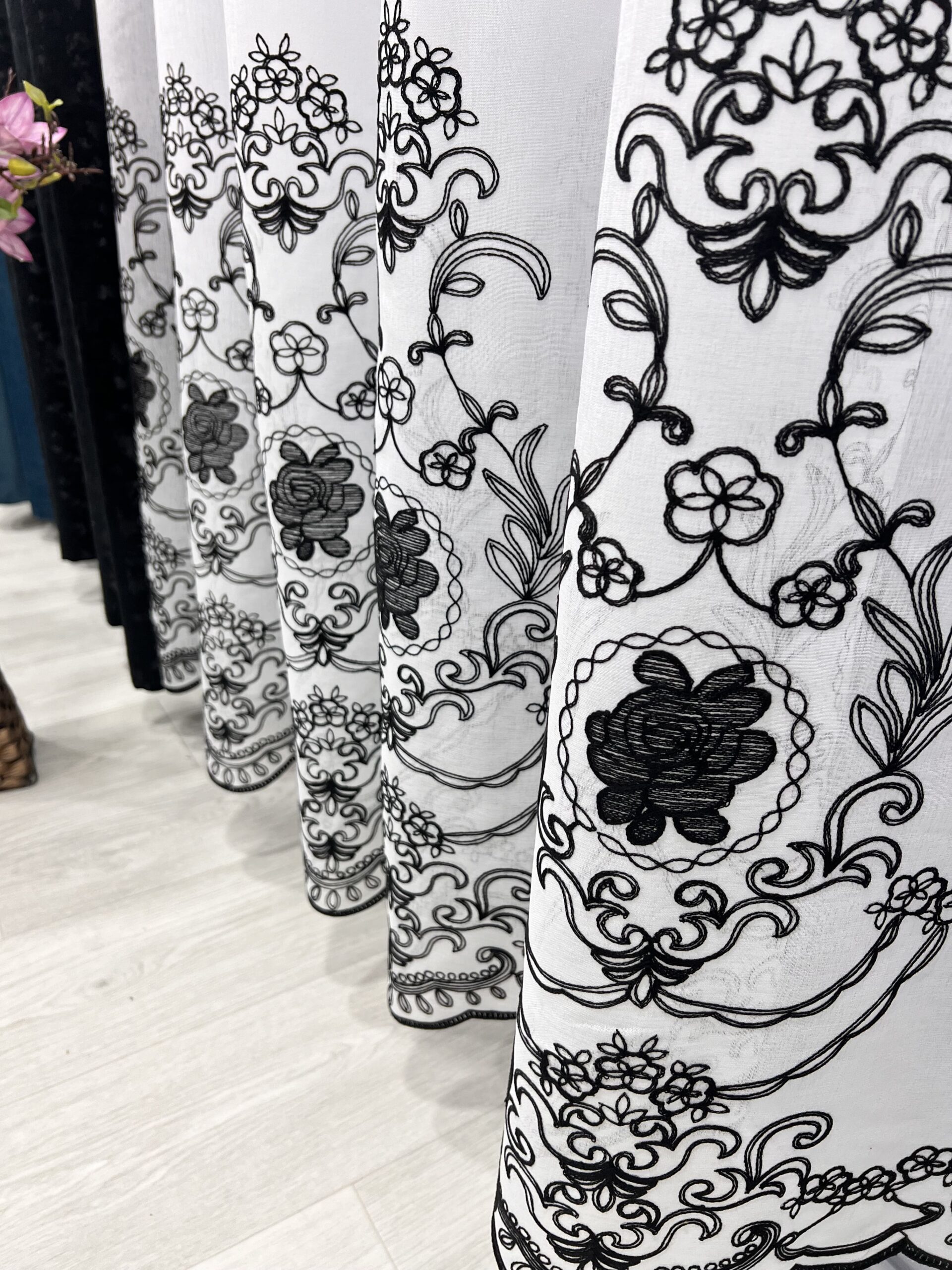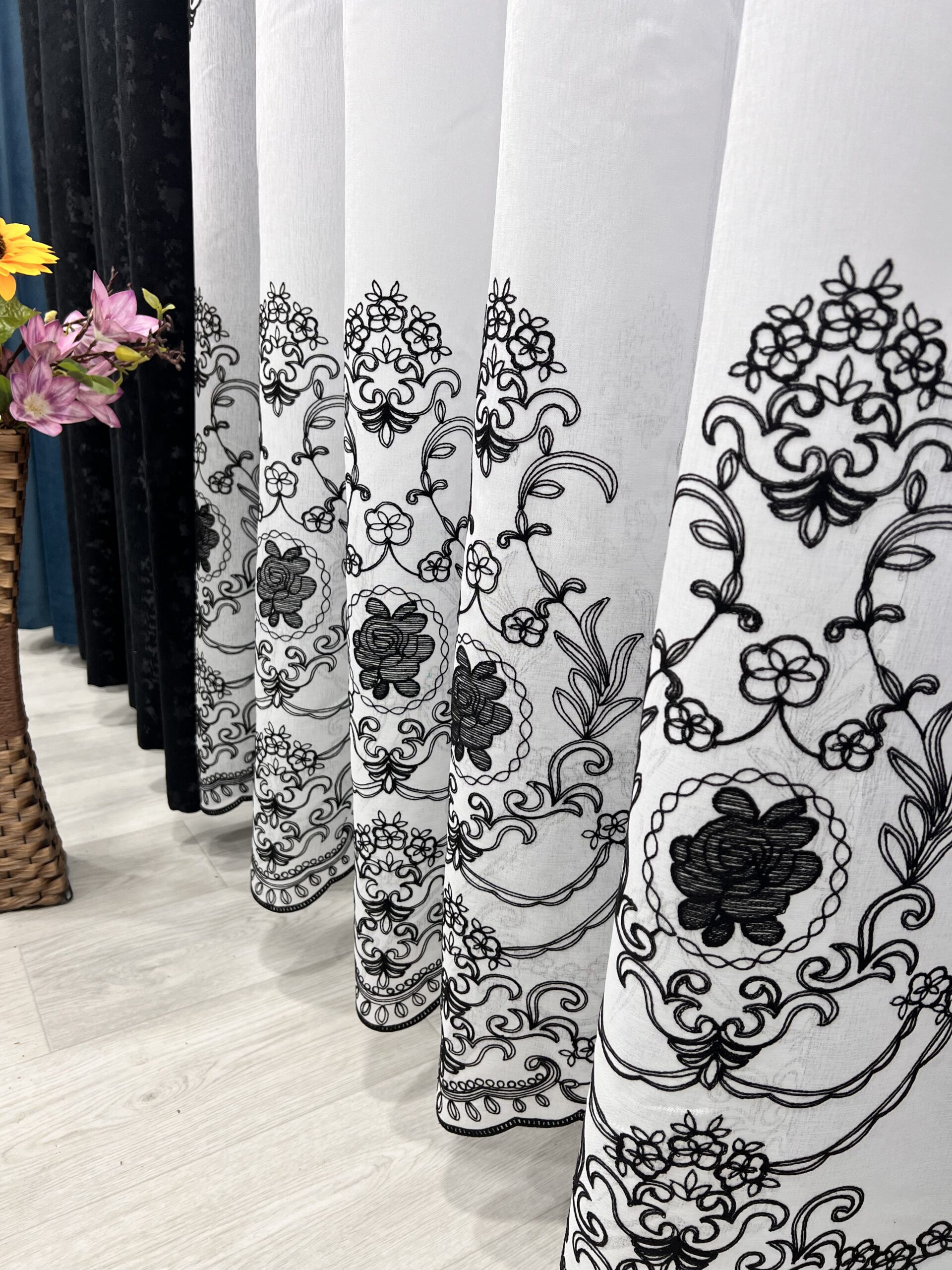 Perdea In cu Broderie Maya cu Flori Negre L1.80m /H2.45m cu Rejansa de 6 cm